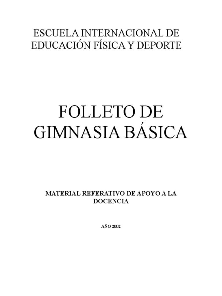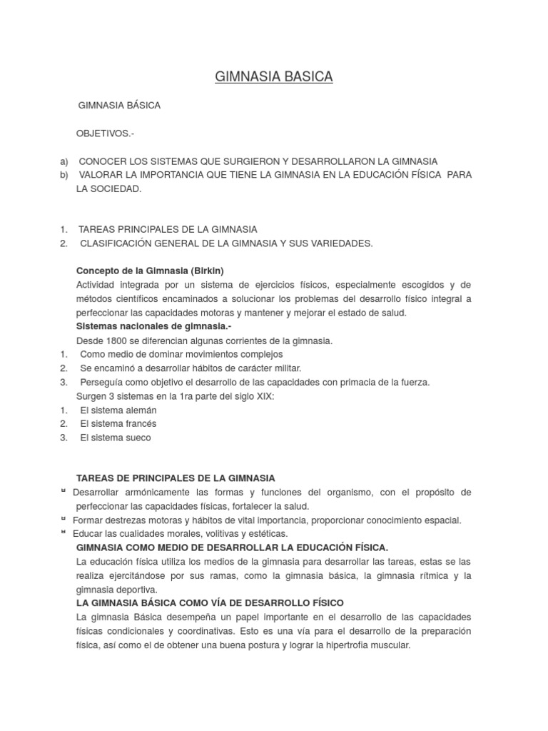 Basica pre escolar escolar gimnasia con el nino gimnasia masiva ejericios de desarrollo fisico general de aplicacion acrobaticos y coreograficosjuegos y ejercicios de organizacion y control aplicada profesional aplicada militar aplicada y deportiva aplicada. 1 algunas modalidades de gimnasia se practican como deporte de competicion en el que se ejecutan secuencias reglamentadas de ejercicios que requieren equilibrio fuerza flexibilidad agilidad resistencia y control. La gimnasia es un practica cuyo origen se remonta a miles de anos antes de cristo con los romanos. La gimnasia educativa basica es un sistema de ejercicios con el objeto de desarrollar corregir perfeccionar y mantener la capacidad de movimiento generando bienestar personal la gimnasia es un medio para alcanzar la educacion y disciplina fisica.