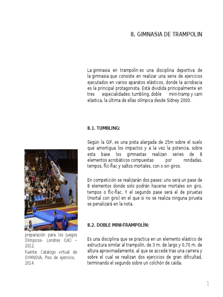 Generalidades la gimnasia de trampolin se integro a la federacion internacional de gimnasia en 1998 y adquirio su caracter de oficial al participar en los pasados juegos olimpicos de sidney 2000. Gimnasia en trampolin. Es una disciplina deportiva de la gimnasia que consiste en realizar una serie de ejercicios ejecutados en varios aparatos elasticos donde la acrobacia es la principal protagonistaesta dividida principalmente en tres especialidades.