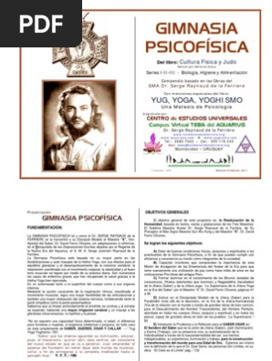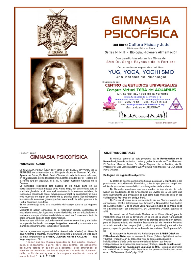 Serge raynaud de la ferriere fundador de la gran fraternidad universal e instaurador de la cultura psicofisica con base en los metodos de la yoga. Marcar segun contenido inapropiado. La gimnasia psicofisica consiste en una serie de movimientos o ejercicios especificos cuya sesion completa nos lleva alrededor de 30 minutos y son preparatorios para la practica de las posturas fisicas o asanas llamada hatha yoga. Descargue como pdf txt o lea en linea desde scribd.