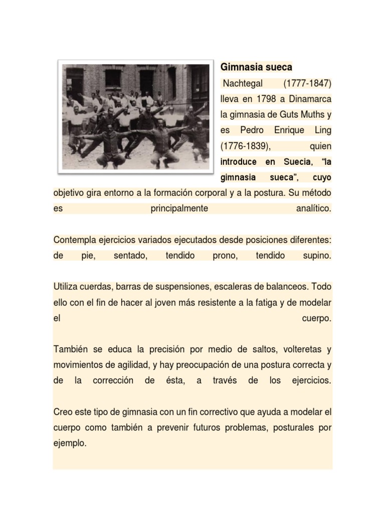 Los principios de la gimnasia sueca el sistema de gimnasia proveniente de suecia propone la practica combinada de varios ejercicios disenados para ejercitar las distintas partes del cuerpo de una manera delicada y armoniosa.