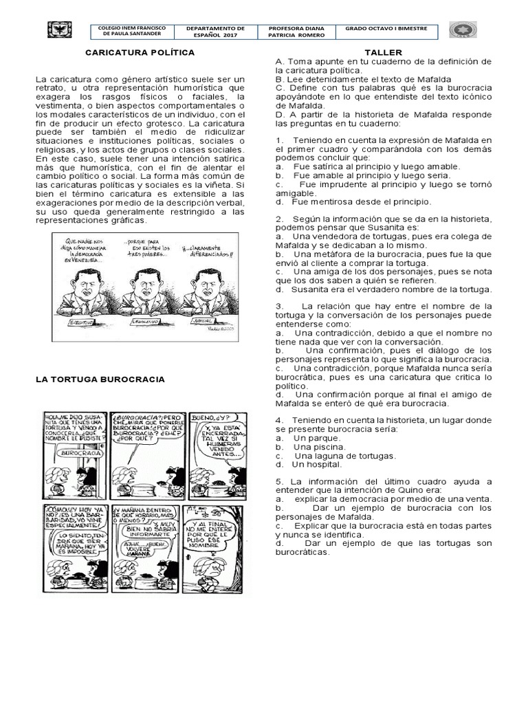 Se trata de una tortuga y el nombre se lo puso porque camina lento. A al principio estaba confundido porque era un nombre inusual para una tortugala burocracia se refiere a los procesos insertados para hacer algo. Mafalda m e f l d e is an argentine comic strip written and drawn by cartoonist joaquin salvador lavado tejon better known by his pen name quinothe strip features a 6 year old girl named mafalda who reflects the argentinian middle class and progressive youth is concerned about humanity and world peace and has an innocent but serious attitude toward problems. B el elemento visual que prueba esto es el dibujo que muestra que.