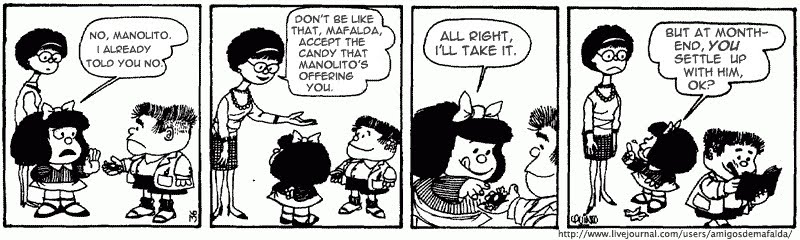 Mafalda m e f l d e is an argentine comic strip written and drawn by cartoonist joaquin salvador lavado tejon better known by his pen name quinothe strip features a 6 year old girl named mafalda who reflects the argentinian middle class and progressive youth is concerned about humanity and world peace and has an innocent but serious attitude toward problems. Hijo de un comerciante de barrio y propietario del almacen don manolo manolito representa las ideas capitalistas y conservadoras dentro de la historieta ademas de constituir una caricatura del inmigrante gallego. Concepto y creacion editar. Manolito al igual que felipe esta basado en una persona real anastasio delgado un inmigrante espanol y dueno de una panaderia ademas de ser el padre de julian delgado un amigo de quino.