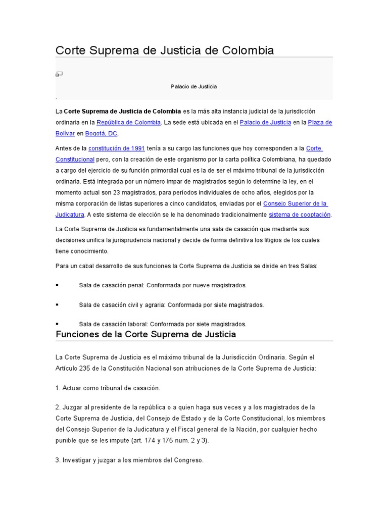 Horario de atencion lunes a viernes 800 am. Finalmente antes de una crisis dificil de conjurar la corte suprema de justicia eligio vacantes y con esto destrabo la eleccion del fiscal general de la nacion que esta por venir. Antes de la constitucion del 1991 tenia a su cargo entre otras las funciones que hoy corresponden a la corte constitucional pero con la creacion de este organismo. Despues de ella vinieron seis magistrados mas.