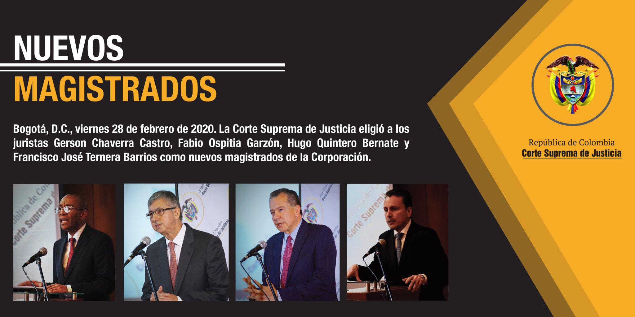 La corte suprema de justicia eligio a los juristas gerson chaverra castro luis benedicto herrera diaz ivan mauricio lenis gomez omar angel mejia amador fabio ospitia garzon hugo quintero bernate y francisco jose ternera barrios como nuevos magistrados de la corporacion. La sala plena de la corte suprema convoca.