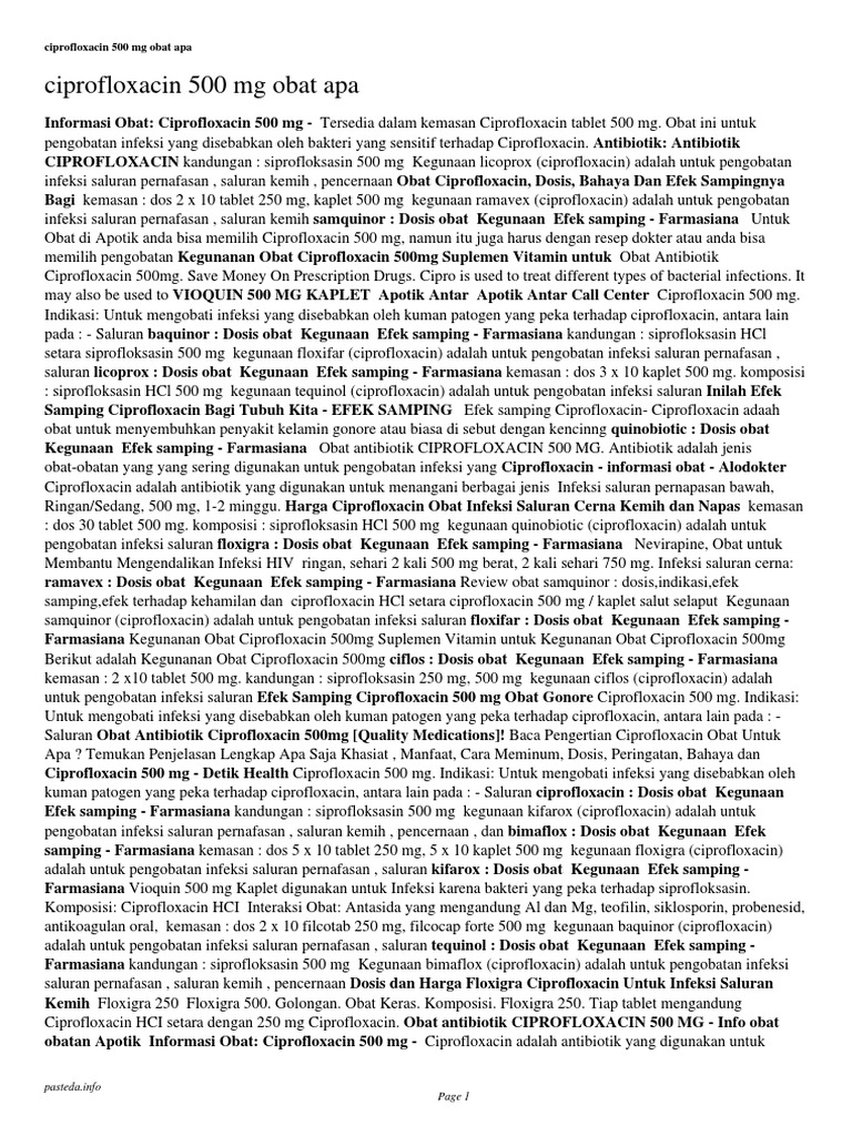 Informasi terlengkap tentang quinobiotic 500 mg 10 kaplet. 250 hingga 500 mg per oral setiap 12 jam. 400 mg 2 kali sehari melalui infus. Ciprofloxacin merupakan antibiotik golongan kuinolon yang digunakan untuk mengatasi.