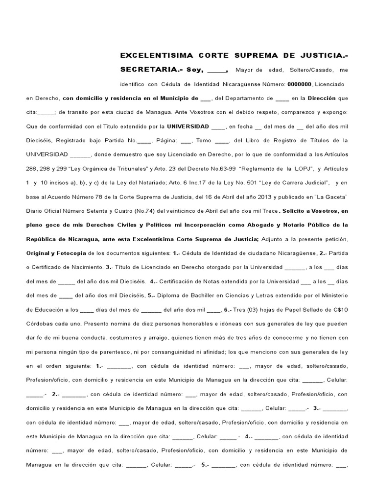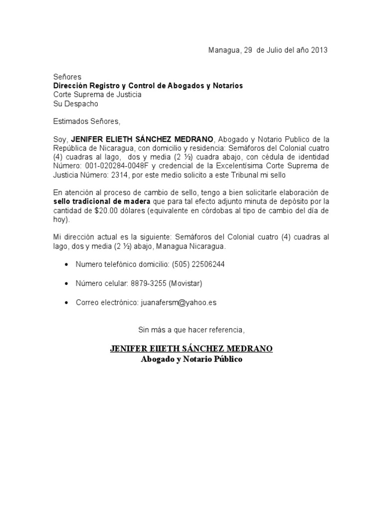 Escrito dirigido a la corte suprema de justicia haciendo referencia que tipo de sello va a requerir direccion telefono correo electronico de conformidad al acuerdo 47 del literal f numeral 3 del 02 de mayo del 2012. Fotocopia de la cedula de identidad.